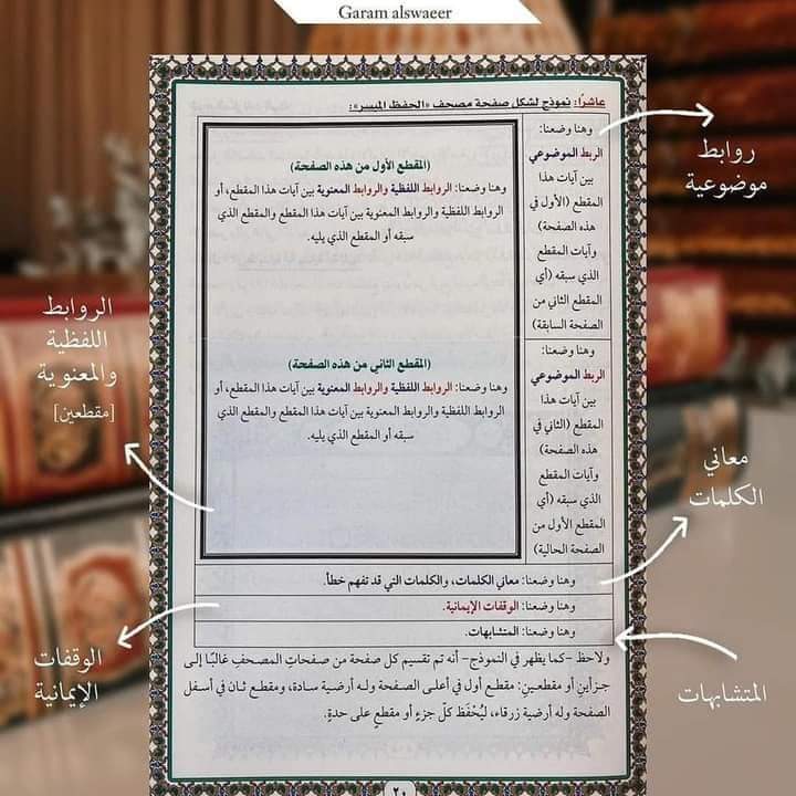 ويعمد مبتكر هذه الطريقة على الخصوص إلى تقسيم كل صفحة من صفحات المصحف إلى جزئين أو مقطعين؛ مقطع أول في أعلى الصفحة وله أرضية صفراء، ومقطع ثان في أسفل الصفحة وله أرضية زرقاء، ليحفظ كل جزء أو مقطع على حدة.